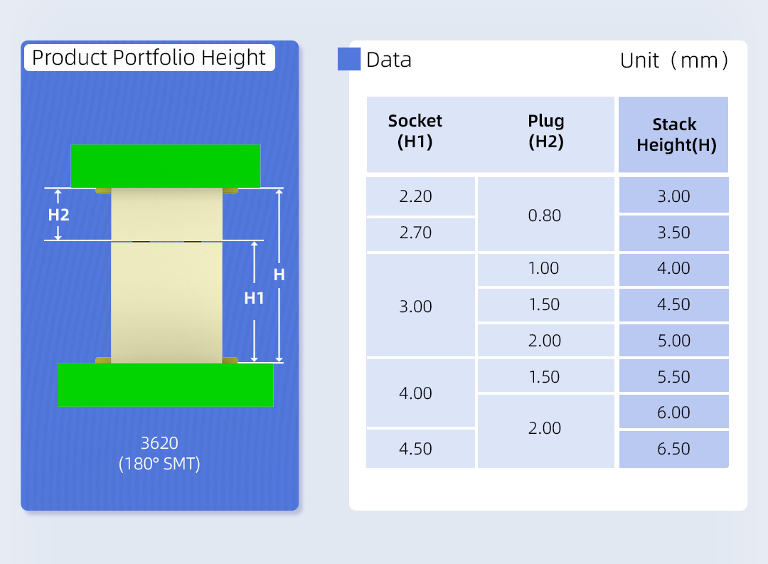 | - Stack height: 3.00–6.50 mm options available. | - Insulation Resistance: 100MΩ Min |
